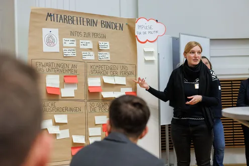 Nach der Begrüßung durch Dr. Sabine Hepperle (Leiterin der Abteilung Mittelstandspolitik, BMWK) und Jens Nagel (Geschäftsführer, RKW Kompetenzzentrum) folgte ein Impulsvortrag von Prof. Marcel Fratzscher, Präsident des Deutschen Instituts für Wirtschaftsforschung (DIW Berlin). In seinem inspirierenden Vortrag machte er darauf aufmerksam, dass Unternehmen besser in ihre Mitarbeitenden investieren müssen, um langfristig attraktiv zu bleiben. Weiterhin sollten Hürden, insbesondere für Frauen und Geflüchtete, abgebaut werden. Darüber hinaus betonte Prof. Fratzscher, dass junge Menschen ohne Berufsabschluss gezielt weitergebildet werden sollten.